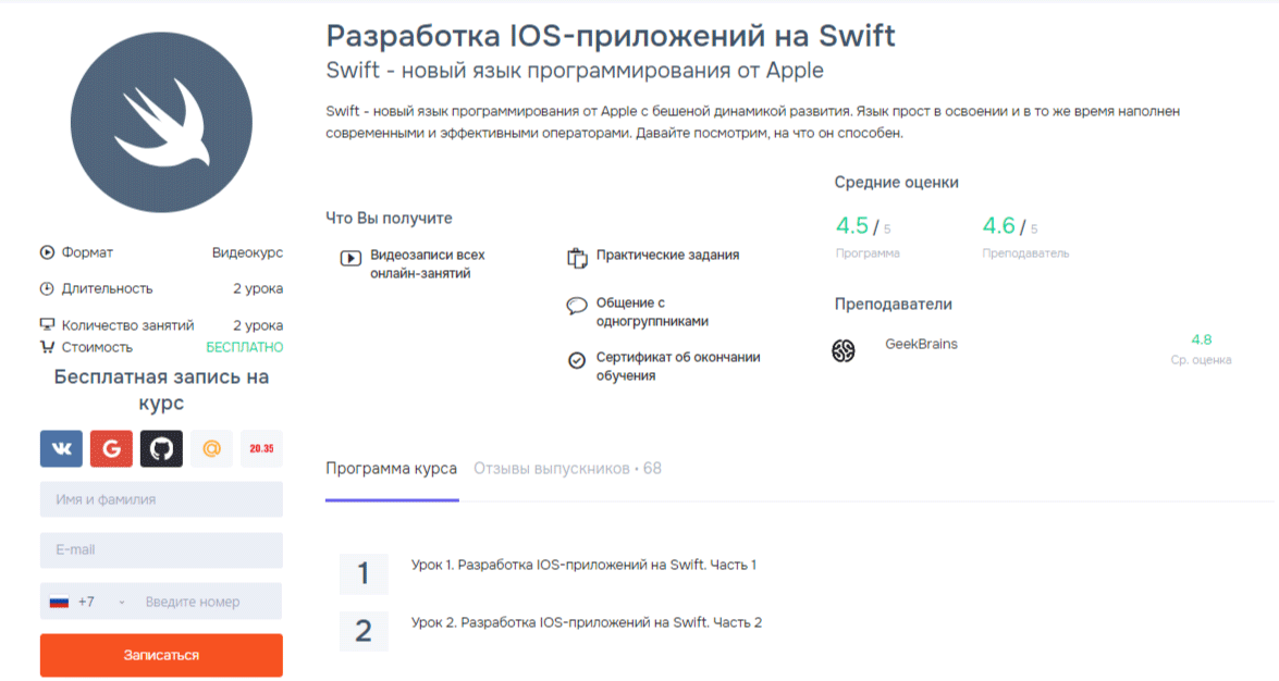 - Чему научитесь: короткий курс по новому языку Swift для будущих и практикующих iOS-разработчиков. Вы сможете общаться с одногруппниками, а после завершения обучения получите сертификат.