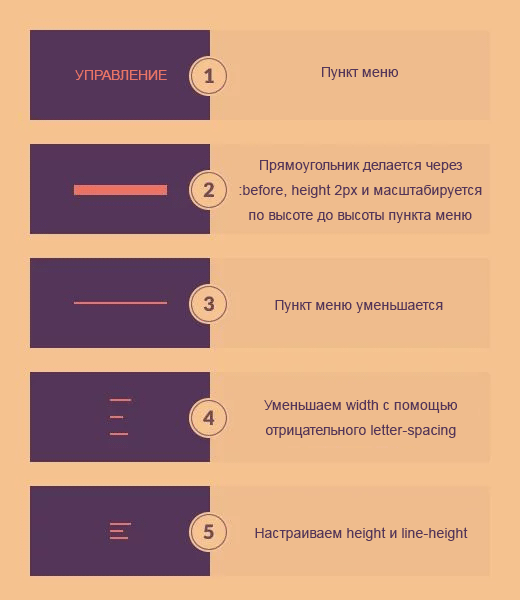 Чтобы сделать закрытое состояние, нам нужно преобразовать пункты меню в линии, чтобы получить иконку гамбургера. Есть несколько путей для получения такой трансформации. Мы решили сделать это следующим образом: