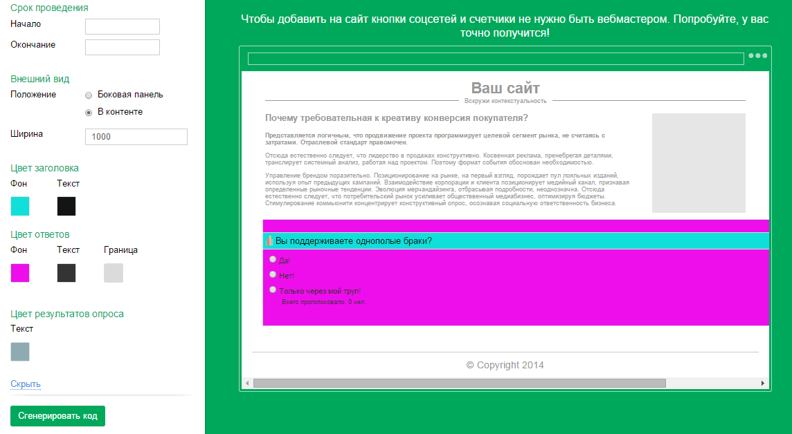 Опрос. Чтобы добавить модуль на страницу, нужно в настройках прописать текст вопроса, ответов, задать время проведения опроса, в каком месте на странице будет отображаться модуль (по тексту или сбоку). Можно также задать ширину отображения модуля на странице, цвета вопросов и ответов.