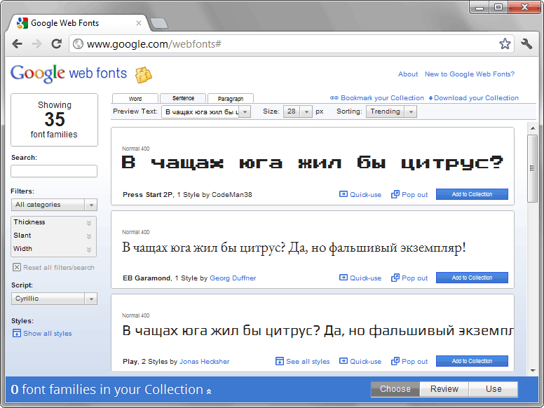 Удобный сервис, берущий на себя рутину по поддержке разных форматов шрифтов и версий браузеров, вы найдёте по адресу www.google.com/webfonts. Хотя в коллекции сравнительно мало разных шрифтов (их несколько десятков), все они подобраны очень качественно и свободны для использования на сайтах.