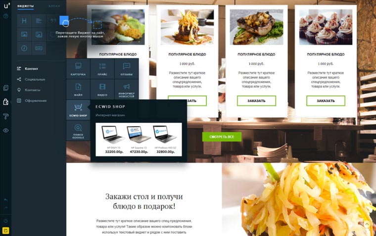 Конструктор – хранилище разнообразных виджетов, которые после перетаскивания на страницу принимают вид блоков с определённой функциональностью. Их можно настраивать. Примеры виджетов: карточка товара, форма, видео, слайдер, Ecwid Shop (набор инструментов для развёртывания магазина), карта, социальная панель, онлайн-консультант, живой чат, обратный звонок, контакты и многое друое;