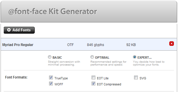 Добавляем свой шрифт или шрифты (у нас это будет Myriad Pro Regular) и выбираем режим «Expert». Можем выбрать форматы шрифтов — рекомендую оставить всё, как есть — это работает, по крайней мере, на всех современных версиях браузеров. Старая Opera (двухгодичной давности) работала, если я не ошибаюсь, с SVG, но там был ужасный рендеринг и без какого-либо сглаживания.