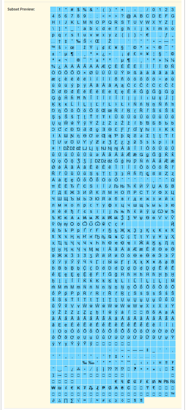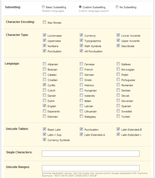 Выбираем Custom Subsetting. Это нужно для того, чтобы выбрать именно те диапазоны символов (сиречь, символы языка), которые нам нужны. А нужны нам, скорее всего, «English», «Cyrillic», ну и иногда я добавляю «Deutch». Также я добавляю то, что на скриншоте — в действительности никогда не знаешь, какие ещё символы смогут понадобиться, а повторять эту процедуру по второму разу (вместе с интеграцией) не особенно хочется.