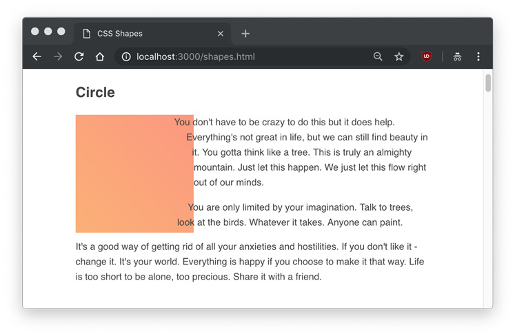Для нашего класса circle мы добавляем float со значением left, присваиваем ему одинаковую высоту и ширину и устанавливаем значение shape-outside как circle().