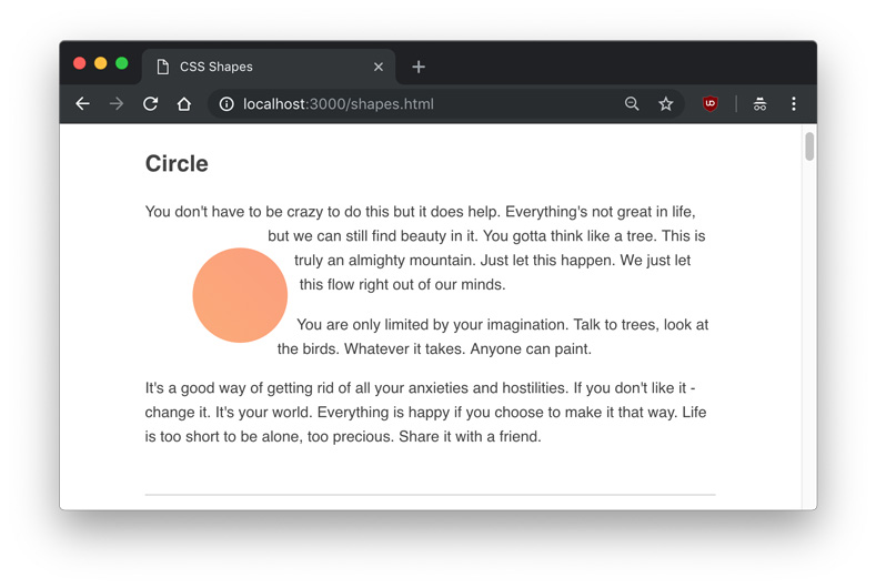 Мы можем ясно видеть обтекающий текст, но не саму фигуру элемента. Если желаем её отобразить, то нужно использовать свойство clip-path. Это свойство принимает те же значения, что и shape-outside, поэтому можем присвоить ему значение circle().