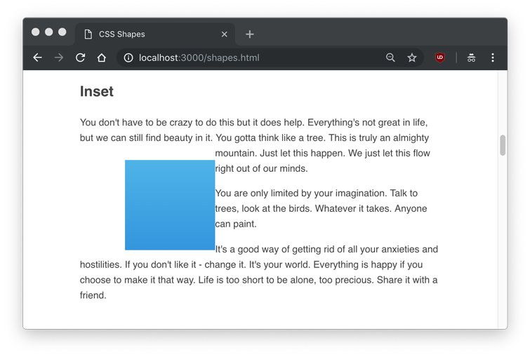 Чтобы добавить свойство shape-outside к элементу, он должен быть обтекаемым, а также у него должна быть установлена высота и ширина. Давайте рассмотрим каждую из четырёх основных фигур и продемонстрируем, как их можно использовать.