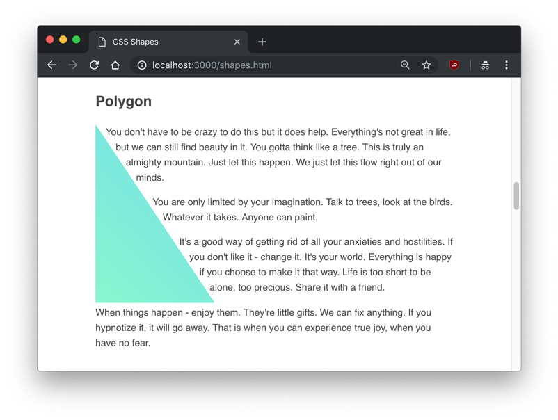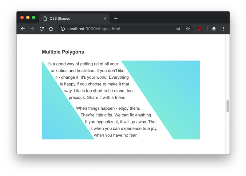Интересное использование функции polygon() заключается в том, что текстовое содержимое может располагаться между двумя или более фигурами. Поскольку фигура polygon() очень гибкая и динамичная, это одна из самых больших возможностей для создания действительно уникальных макетов в журнальном стиле. В данном примере мы поместим текст между двумя многоугольниками.