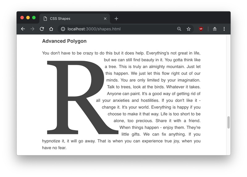 Многоугольники можно использовать для вырезания фигур вокруг изображений или других элементов. В данном примере мы создаём буквицу, нарисовав многоугольник вокруг большой буквы.