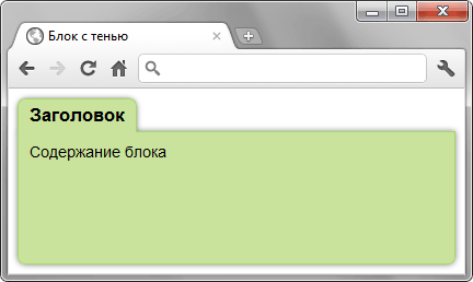 Сделайте блок, показанный на рис. 1. Блок содержит скругления в заголовке и внизу блока. Вокруг блока тёмно-зелёная рамка и тень. Длина заголовка может меняться, соответственно, должна изменяться и ширина блока под ним, но при этом не превышать 250px.